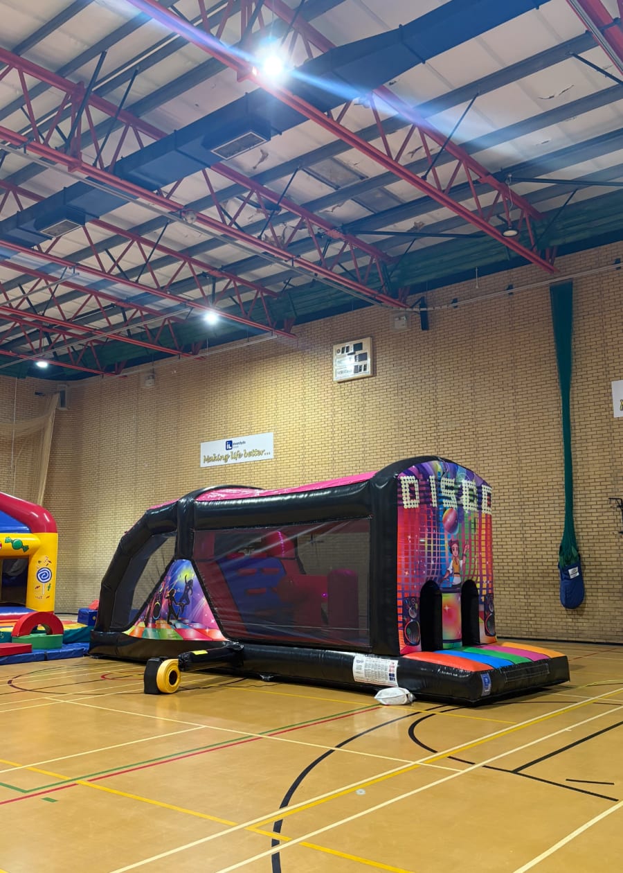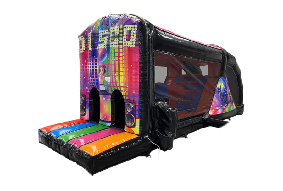 Get ready to groove and move with the 27ft 1 Part Disco Obstacle Course, a creation by Airquee Inflatables that brings the magic of the disco era to your playtime adventures. With vibrant disco-themed artwork featuring music notes, DJ speakers, glitter balls, and the text "disco club," this inflatable obstacle course is the ultimate destination for music enthusiasts and dance lovers alike.